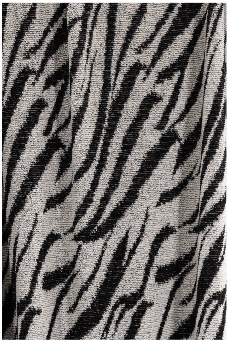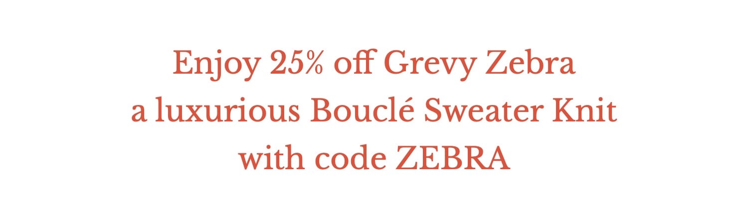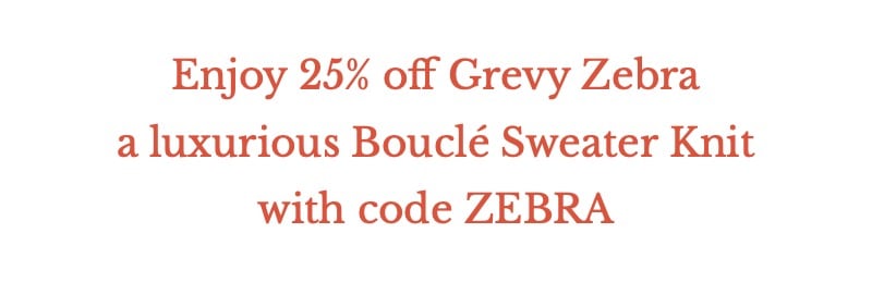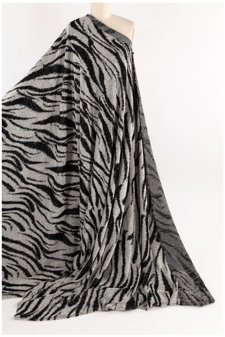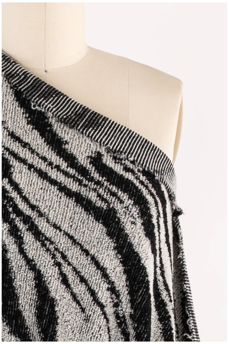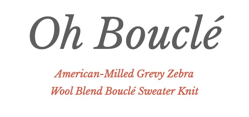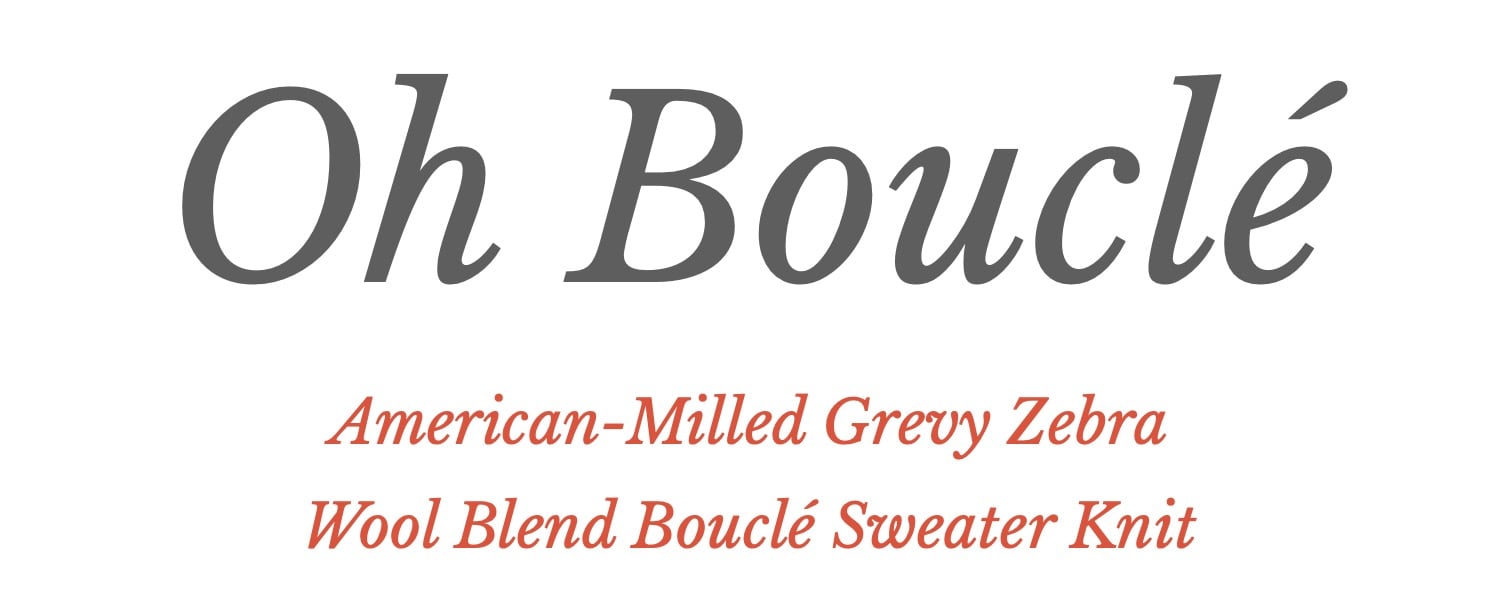 Grevy Zebra, an American-milled bouclé sweater knit in a luxurious blend of wool, nylon, and a touch of spandex.
